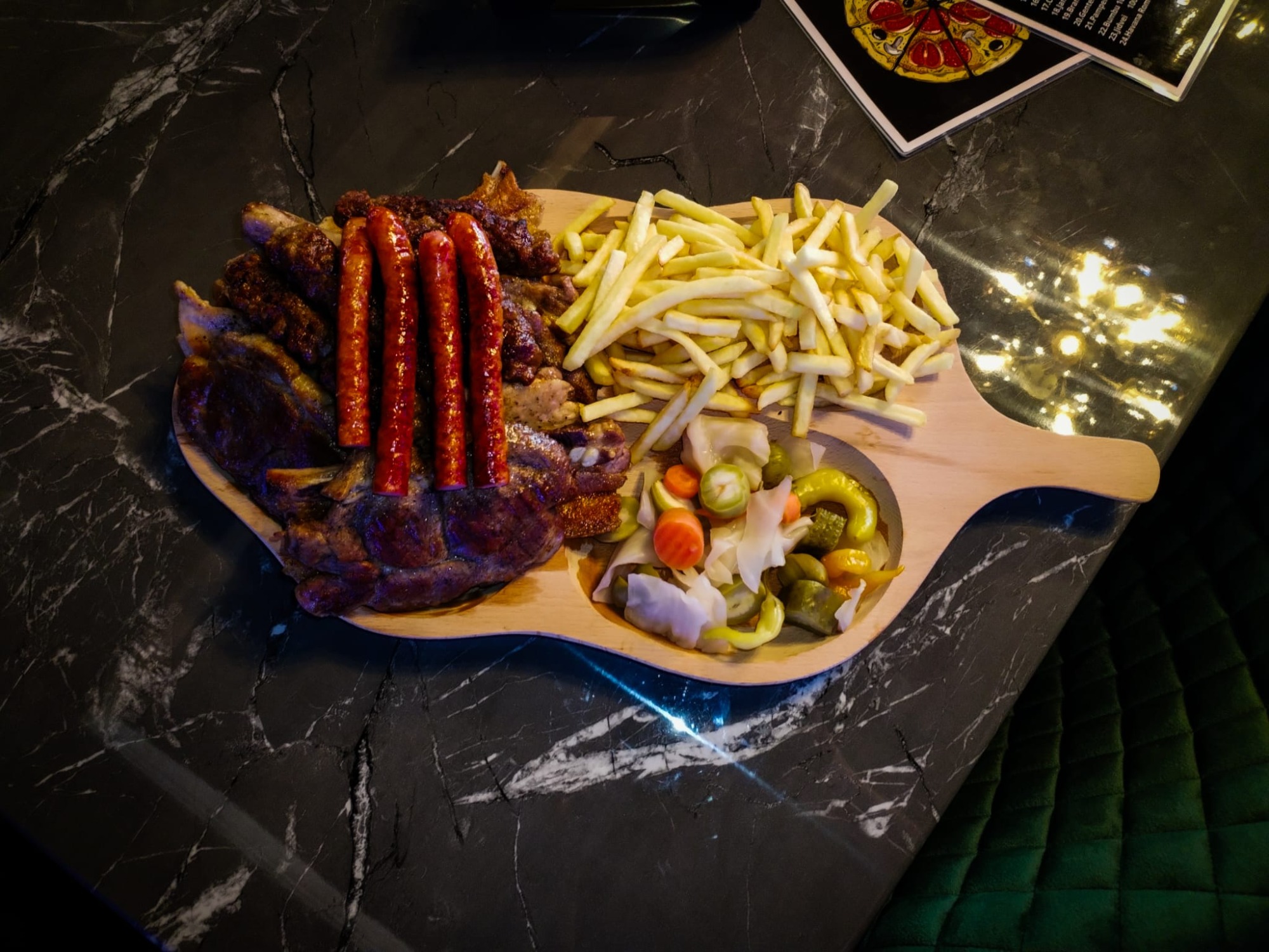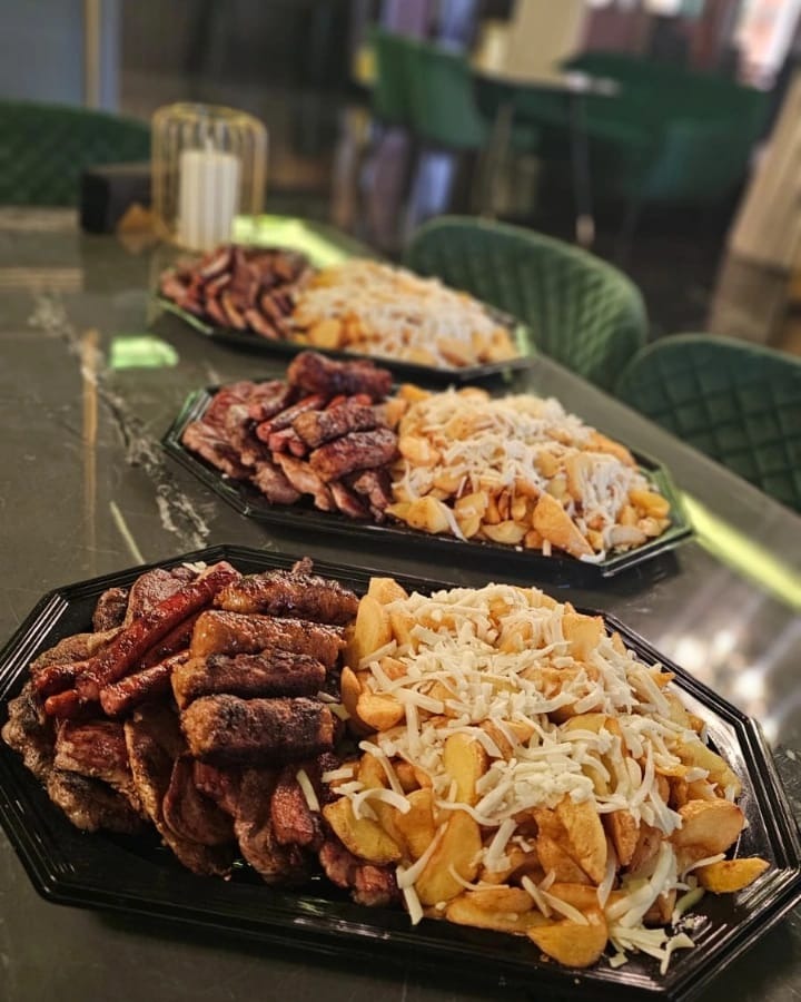 3 buc. Mici, 3 buc cârnați, cartofi prăjiți, sos usturoi